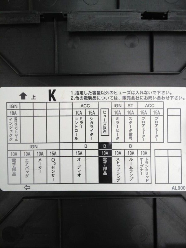 運転席下のヒューズボックス早見表。